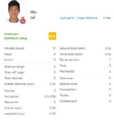 武磊统计:上场时间再次不足10分钟,只有3次触球和0次射门。