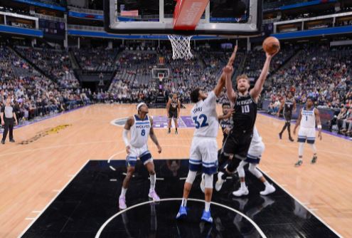 明尼苏达森林狼队的卡尔-安东尼·唐斯(#32)在对阵萨克拉门托国王队的比赛中扣篮得分
