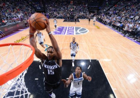 萨克拉门托国王队的戴维恩·米切尔(#15)在对阵明尼苏达森林狼队的比赛中扣篮得分